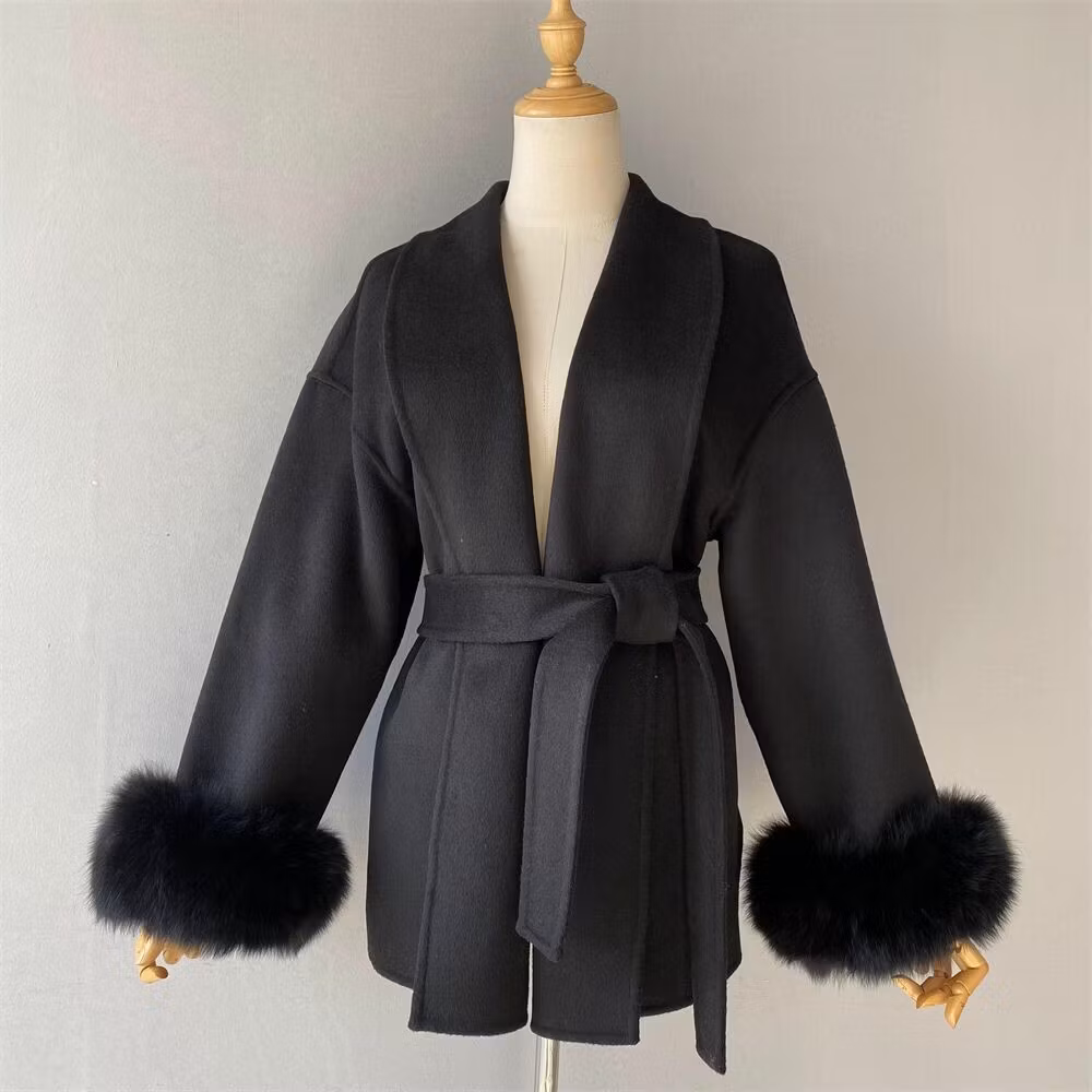 Kappan består av 90% ULL och 10% kashmir, pälskragen består av 100% rävpäls.