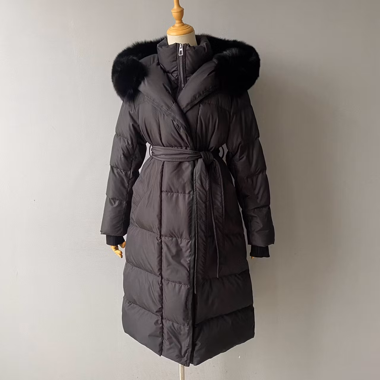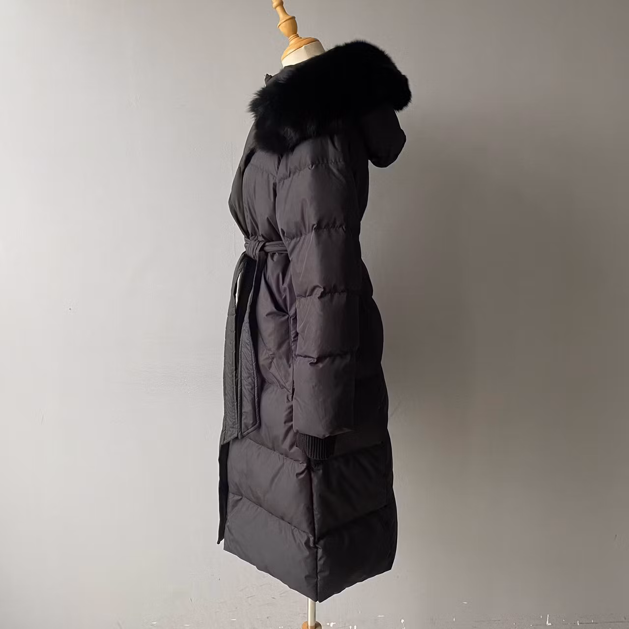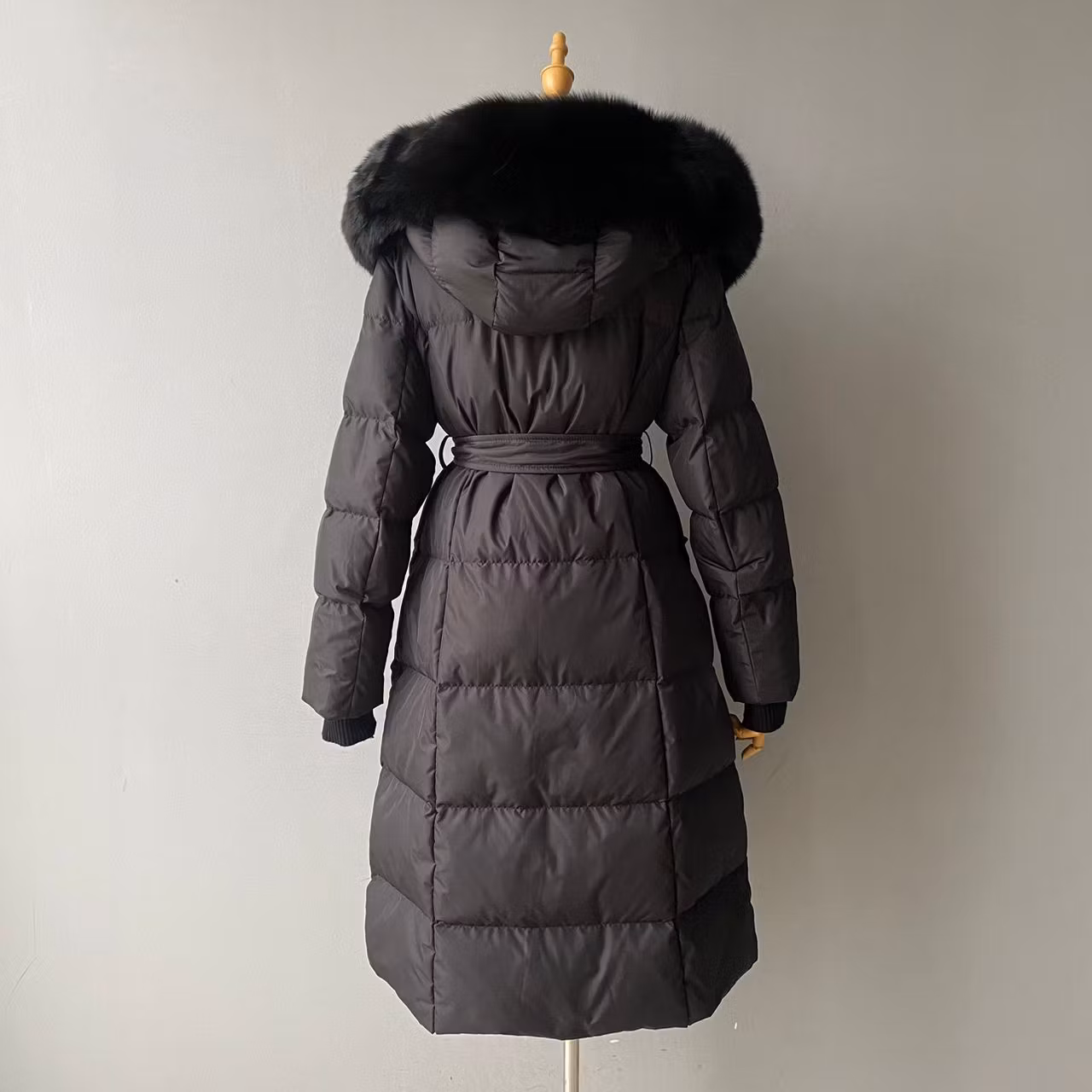 Dunjacka med dragkedja, usterbart och avtagbart band i midjan med rymlig luva samt avtagbar päls. Funkar därför väldigt bra under vinterhalvåret.