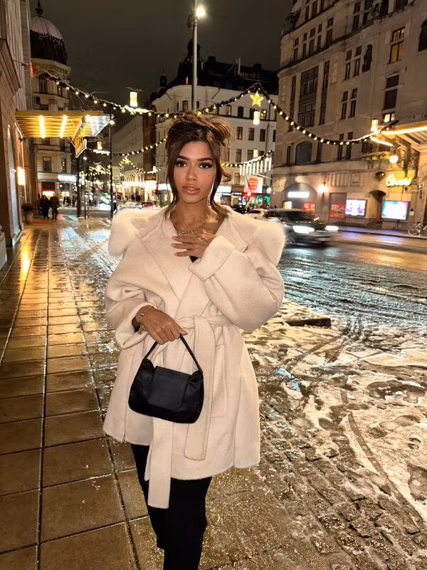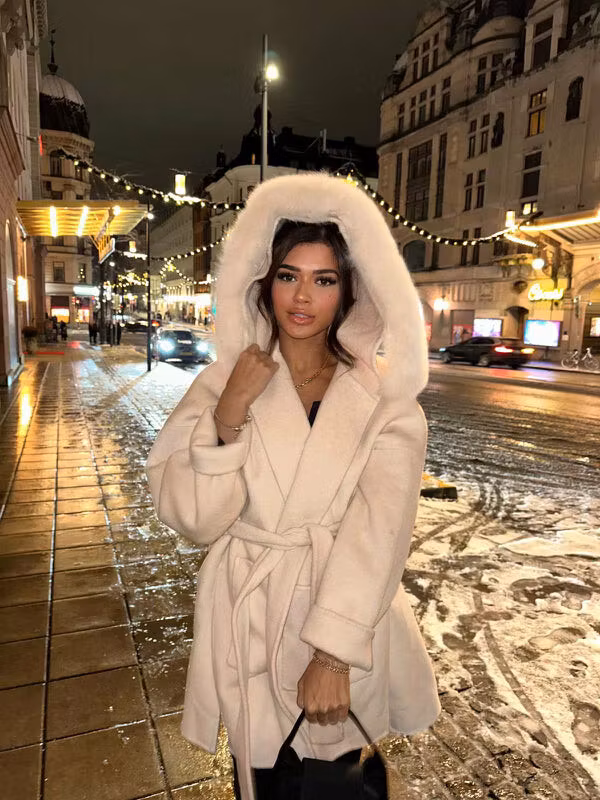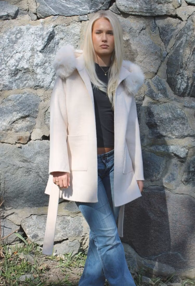 Vår bästsäljare- klassisk tidlös modell i en ull mix, samt en rymlig luva med äkta päls. Justerbart band i midjan samt avtagbar päls. Med tanke på materialet (u