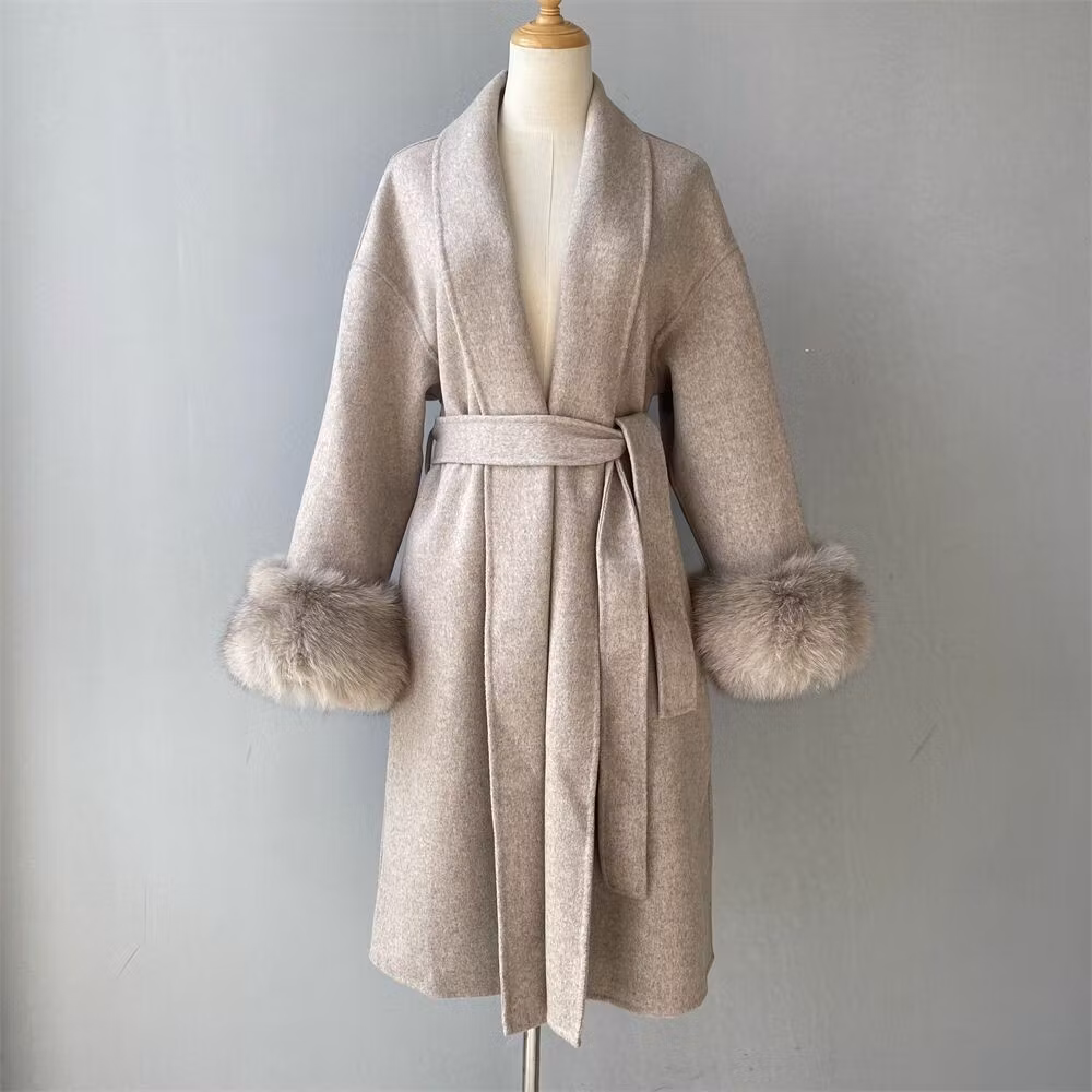 Kappan består av 90% ULL och 10% kashmir, pälskragen består av 100% rävpäls.