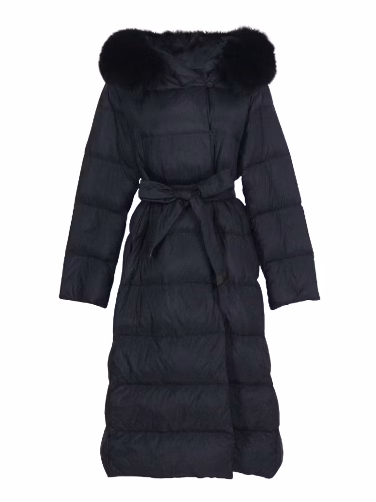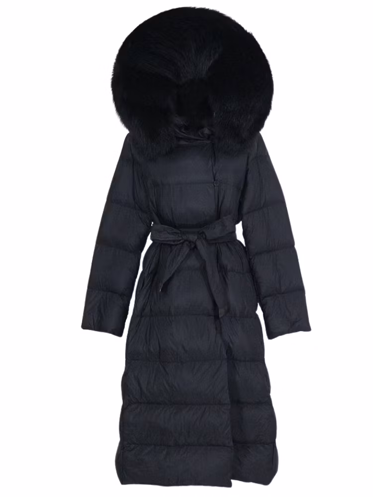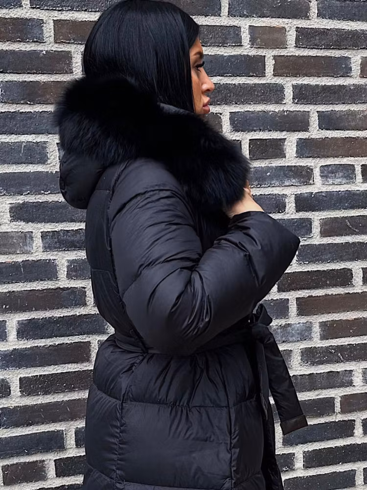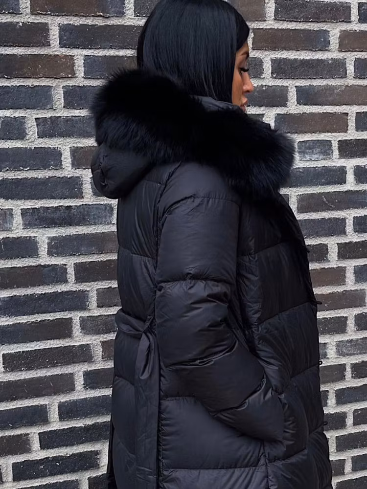 Lång något tunnare dunjacka med justerbart och avtagbart band i midjan med rymlig luva samt avtagbar päls. Funkar därför väldigt bra under vinterhalvåret.Om du