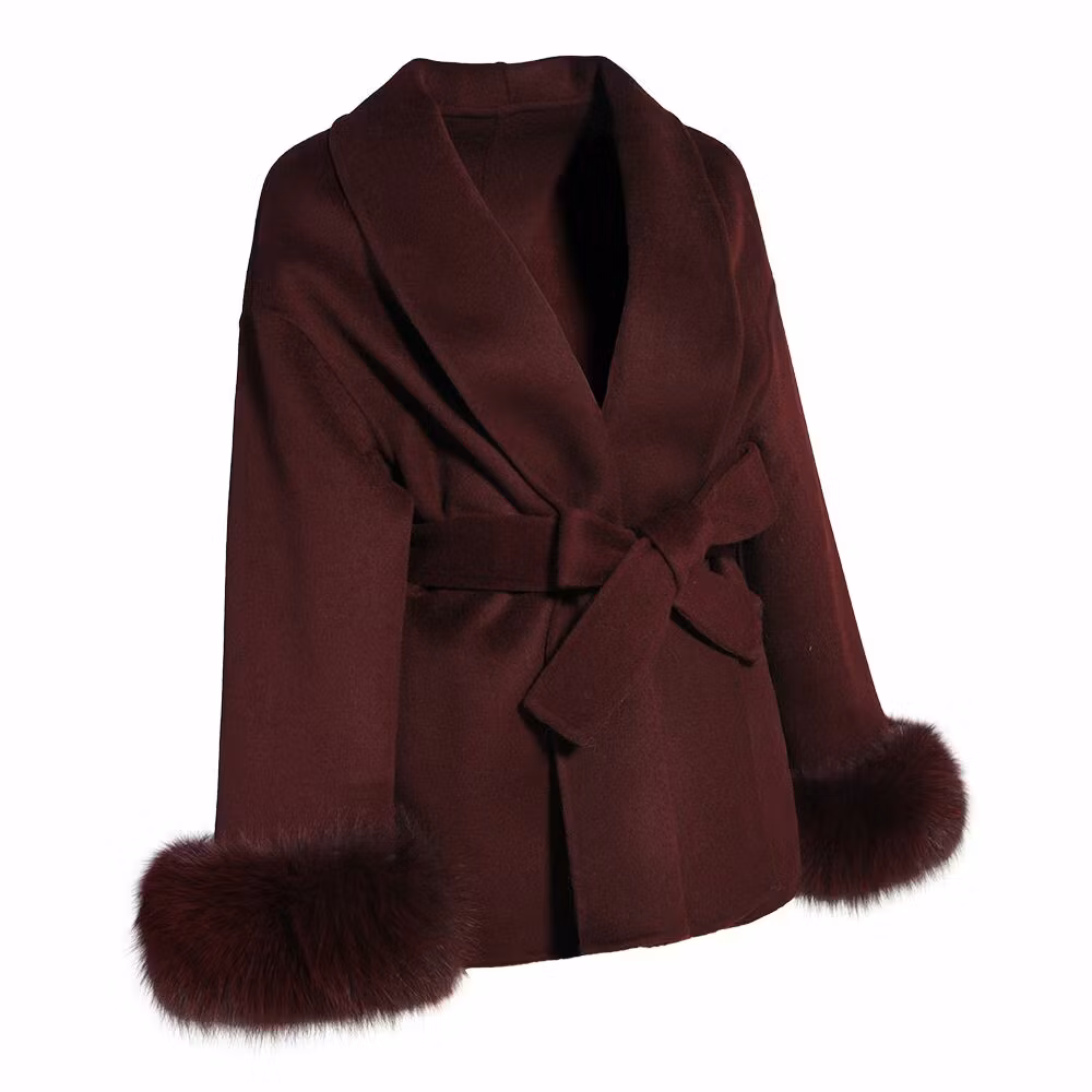 Kappan består av 90% ULL och 10% kashmir, pälskragen består av 100% rävpäls.