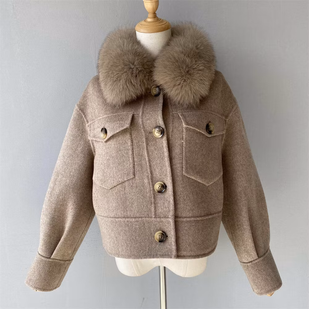 Jacka i ull, kashmir & rävpäls. Den har en pälskrage, puffar och har även rymliga fickor. Försluts med en dragkedja framtill