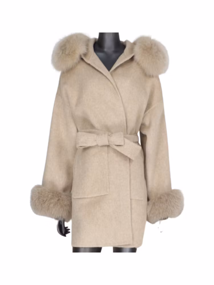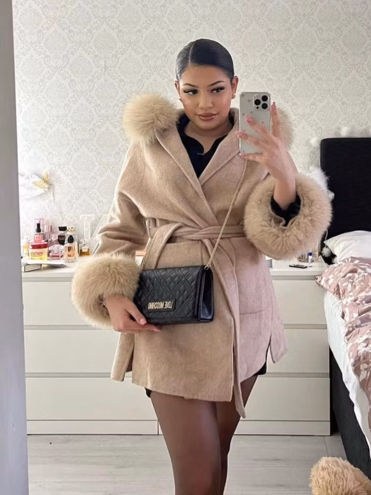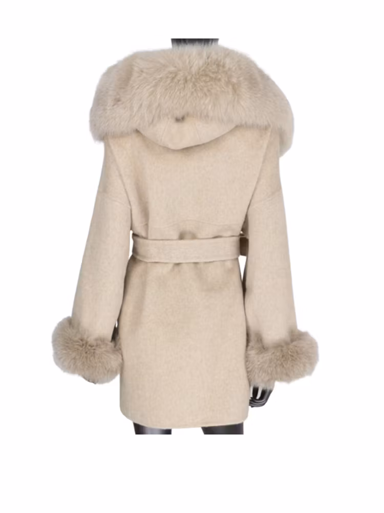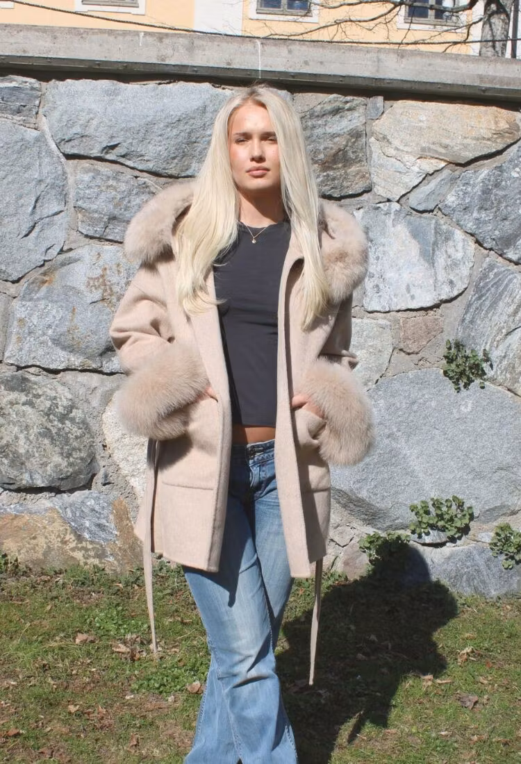 Vår bästsäljare- klassisk tidlös modell i en ull mix, samt en rymlig luva med äkta päls. Justerbart band i midjan samt avtagbar päls. Med tanke på materialet (u