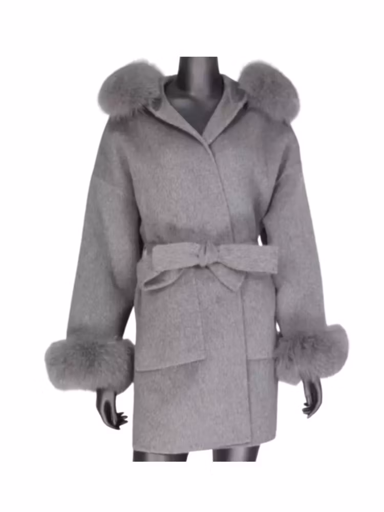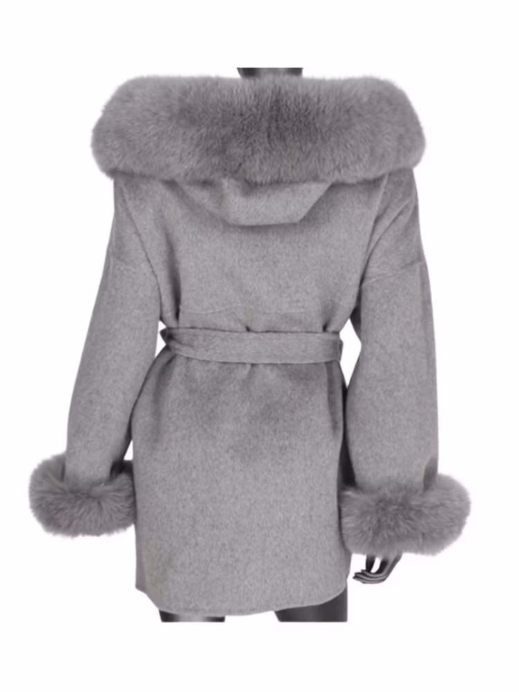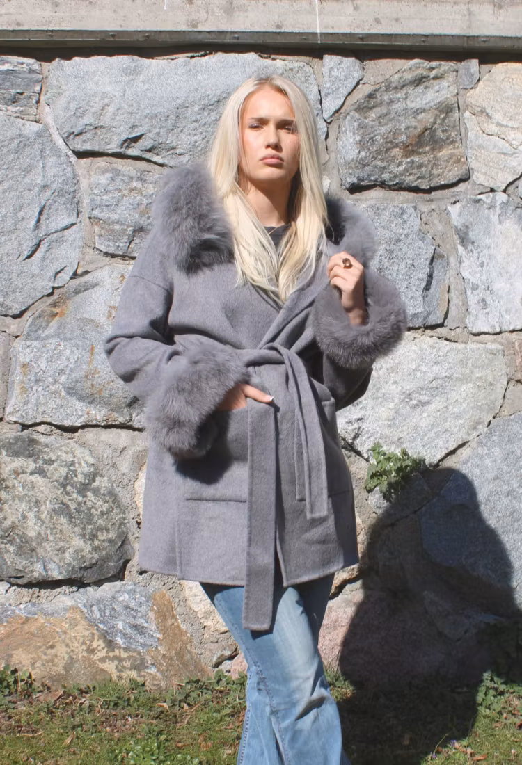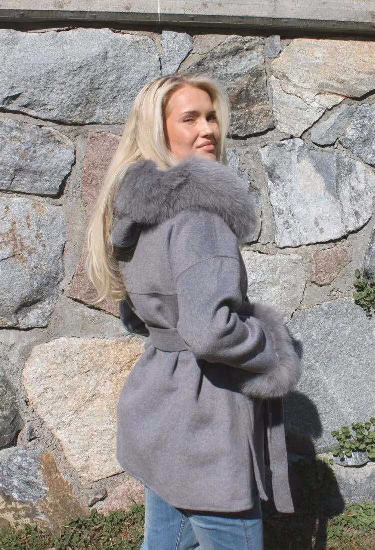 Vår bästsäljare- klassisk tidlös modell i en ull mix, samt en rymlig luva med äkta päls. Justerbart band i midjan samt avtagbar päls. Med tanke på materialet