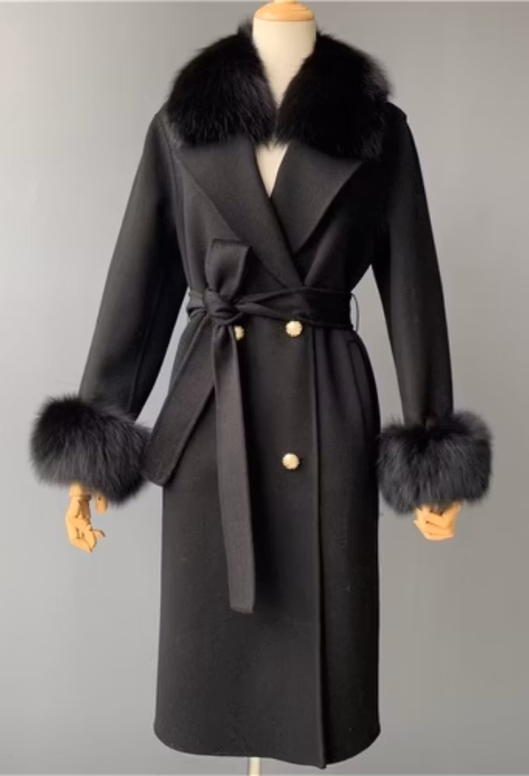 Kappan består av 90% ULL och 10% kashmir, pälskragen består av 100% rävpäls.
